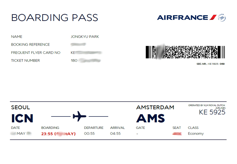 위의 탑승권은 대한항공에서 KLM 비행편을 코드쉐어로 예약 후 에어프랑스 홈페이지에서 예약내역까지 할 수 있다는 것을 보여준다. 코드쉐어는 물론 KLM과 에어프랑스 시스템의 관계를 잘 보여준다.