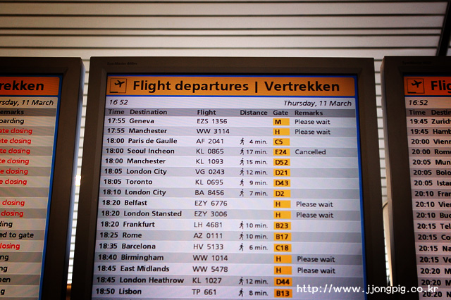 KLM 네덜란드 항공의 스케줄은 0시 55분 출발이다(KL0856). 그래서 그 전날 밤에 공항에 도착을 해야 하기 때문에 항공편 조회나 출국일 체크시 좀 더 주의깊게 확인해야 한다.
