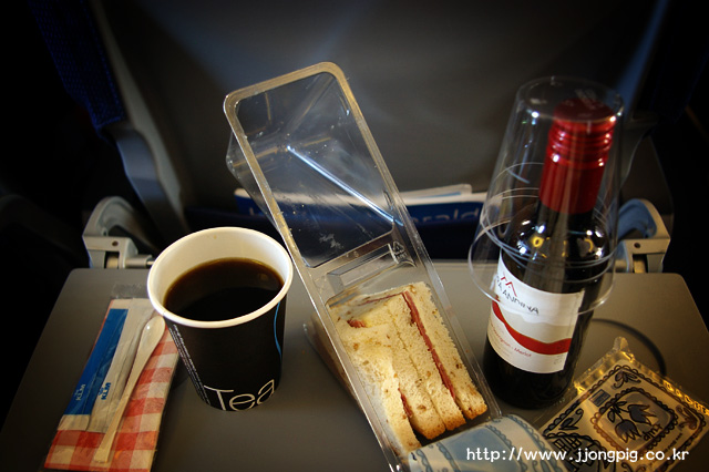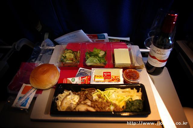 와인은 레드와인과 화이트 와인중에 선택 가능한데 잔에 주지 않고 미니병을 그대로 준다. 개인적으로는 좋다. 개인적으로는 기내식이 팍팍하면 레드와인을, 국물이 있는 약간 자박한? 음식이라면 화이트 와인을 추천한다.