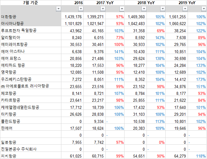 카타르 항공과 알리탈리아가 조금 주춤할 뿐 다른 항공사들은 전년대비 좋은 실적을 보여주고 있다.