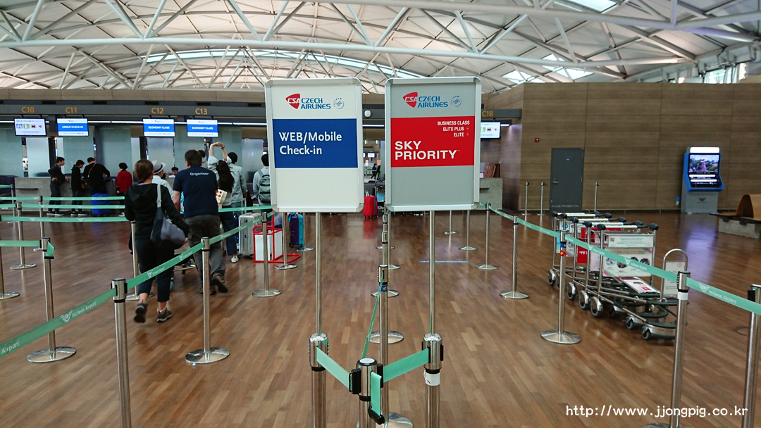 우리는 분명히 KE5935 편을 이용하는 대한항공승객으로서 인천공항을 갔지만, 실제운항사는 체코항공이기 때문에 1터미널로 이동해야했다. (물론 지금은 인천공항 제2터미널에서 이용 가능하다.) 체크인 카운터의 비즈니스석 전용카운터로 이동하여 수속을 진행한다. 체코항공의 비지니스석은 위탁수하물을 32kg 2개까지 무료로 부칠 수 있다. 하지만 여행하면서 32kg가 넘어가면 수하물 초과요금이 문제가 아니라 여행할지 부터 고민해야 될것이다.