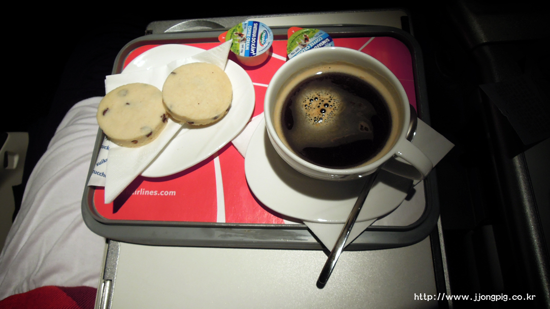 기내에 탑승하면 간단한 음료와 다과가 제공된다. 승무원분이 1:1로 인사해주시고, 짐 정리도 같이 도와주신다.