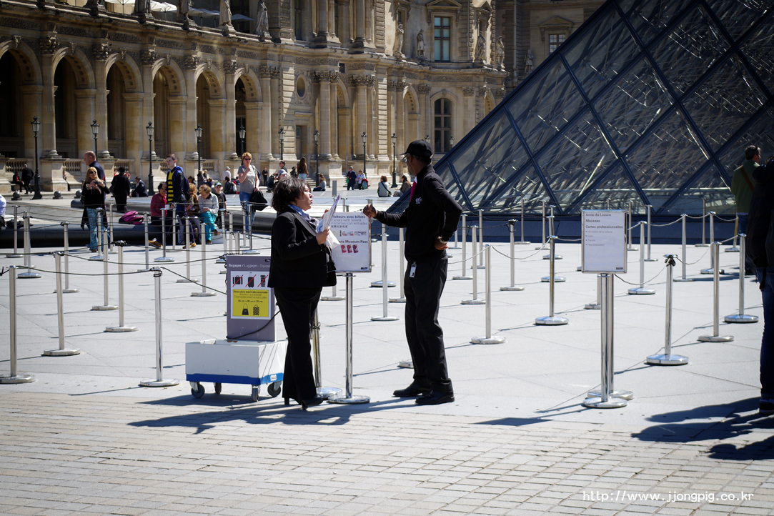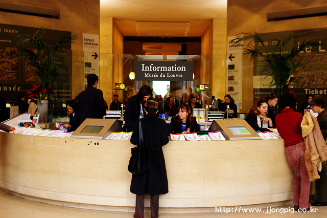 그리고 입장도 저 곳에서 한다. 그런데 여름처럼 사람들이 많이 몰리는 시기에는 줄을 길게 서는 경우가 많다. 그럴 때에는 루브르박물관 지하철 역에서 지하상가를 지나는 출입구를 이용해도 괜찮다. 그러나 붐비기는 마찬가지다. 솔직히 입장권 구입하는것 때문에 붐빈다기 보다는, 보안검색하는것 때문에 붐빈다고 해야 더 정확할 것 같다. 아무튼 지하로 들어가면 웅장한 맛은 없겠지만, 지하철을 타고 바로 편하게 들어갈 수 있다는 최대의 장점이 있다.