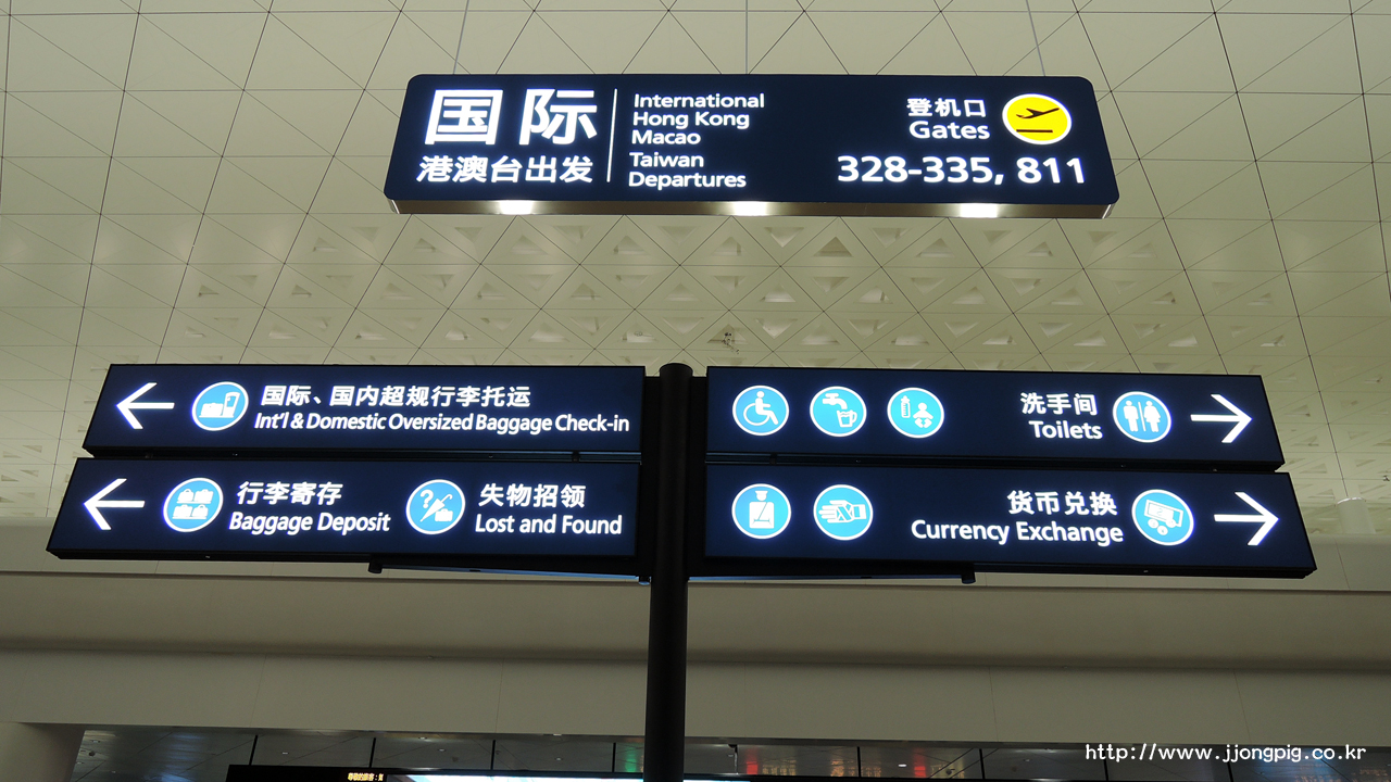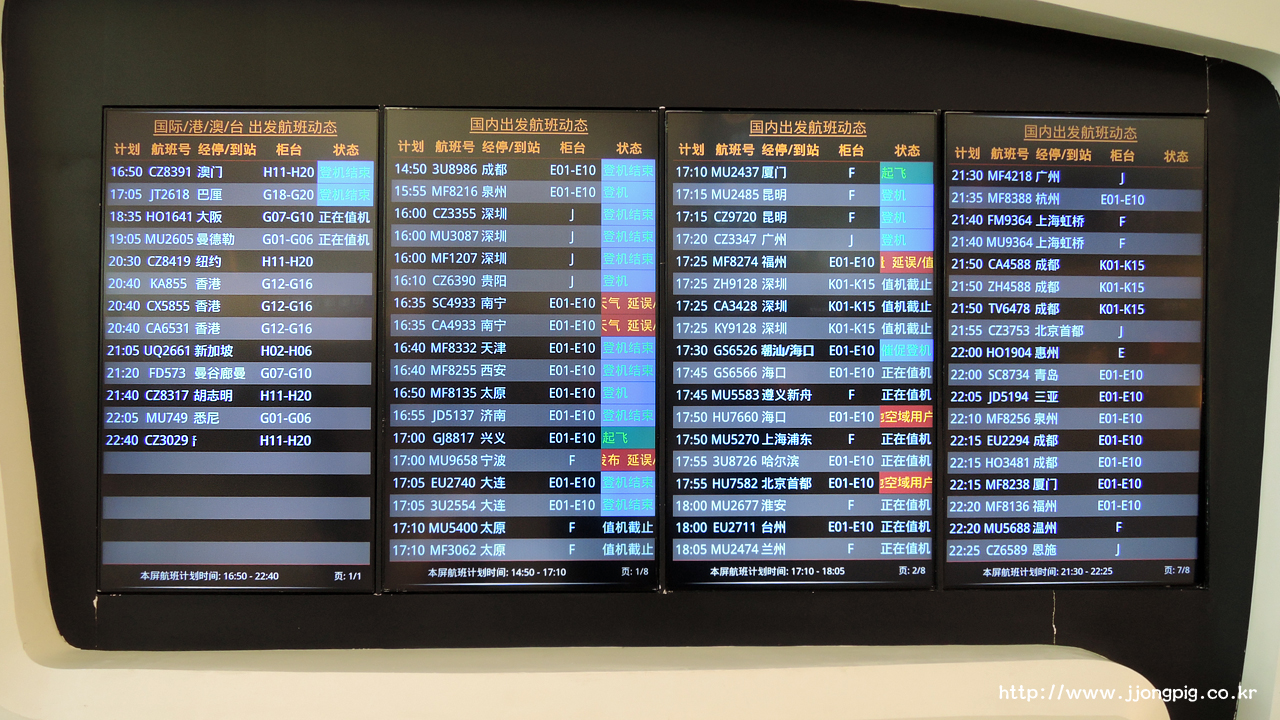 출발층으로 올라가면 출발 비행편별로 어디 카운터에서 수속해야 되는지 확인이 가능한데, 국제선은 맨 왼쪽란에 별도로 모아 놓았다. 중국어로 안내 되기 때문에 편명 기준으로 찾는것이 오히려 편한것 같다.