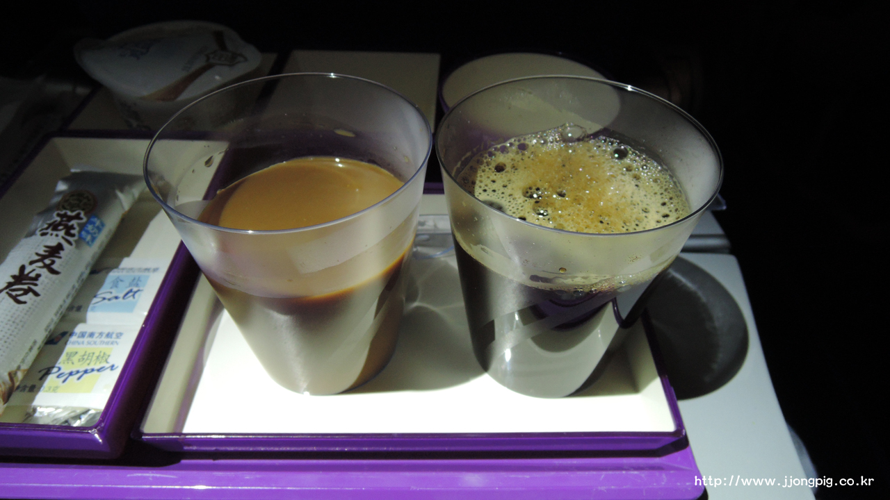 커피는 블랙커피와 밀크커피를 선택해서 제공받을 수 있는데, 밀크커피는 2:1:2 (커피:설탕:프림) 정도의 비율이라고 보면 될 것 같다. 다만 찜찜한거는 컵인데, 뜨거운 커피를 저렇게 플라스틱 컵에 그냥 줘도 되는건지... 환경호르몬 위험은 없나 싶고, 기내식 트레이에 있는 컵은 거의 활용을 안하고 있었다.