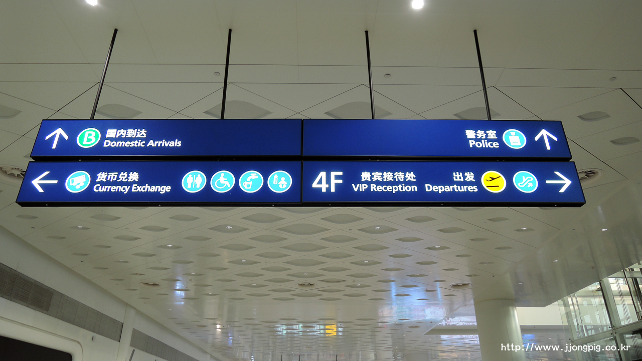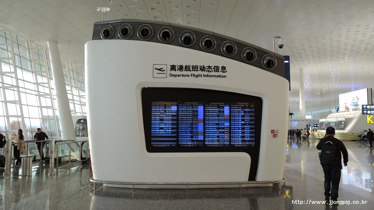 출발층으로 올라가면 출발 비행편별로 어디 카운터에서 수속해야 되는지 확인이 가능한데, 국제선은 맨 왼쪽란에 별도로 모아 놓았다. 중국어로 안내 되기 때문에 편명 기준으로 찾는것이 오히려 편한것 같다.