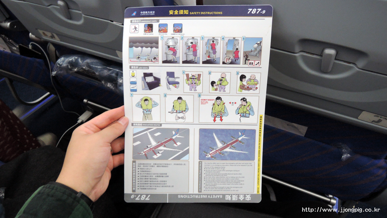 Boeing 787-900 기종에 맞는 내용이 들어가 있다. 혹시나 바다에 이쁘게 빠졌을 때 맨 뒷자리로도 탈출이 가능하다고 나온다. Boeing 737-800 기종은 불가.