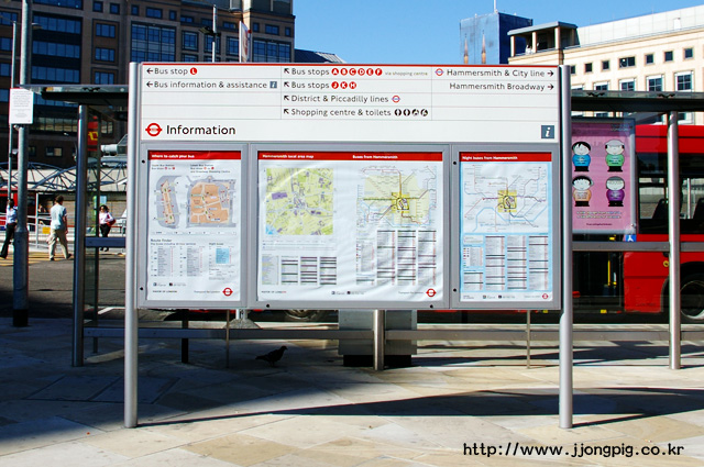 Hammersmith의 F 정류장에서 탑승하면 된다라고 나와 있어서, 정류장만 잘 찾아가면 전혀 문제가 없다. 그래서 런던을 처음 방문하는 사람도 어렵지 않게 버스를 이용할 수 있다. 이렇게 정류장이 분산되어 있고 안내를 잘 하다보니 서울처럼 버스 5대가 연달아 서있는 경우도 없고, 버스기사나 승객이나 서로 편하게 버스를 이용할 수가 있다.