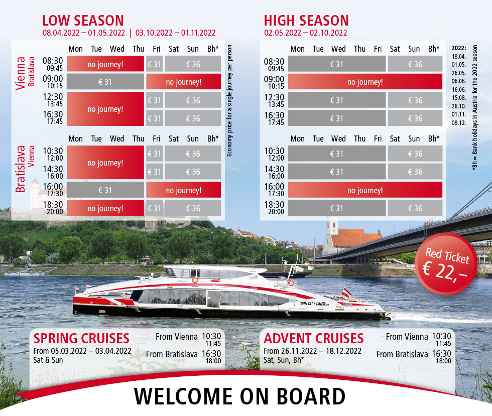 - 빈에서는 Schwedenplatz 에서 출발해, 다뉴브 강을 따라 브라티슬라바의 Most SNP 쪽에서 내리게 된다.
