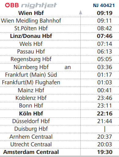 - 암스텔담을 출발해 빈을 최종목적지로 하는 야간열차다.