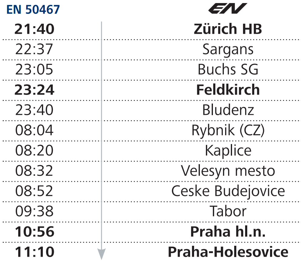 - 취리히를 출발해 오스트리아 인스부르크 등을 거쳐 프라하 까지 가는 야간열차가 있다. (독일 경유 X)