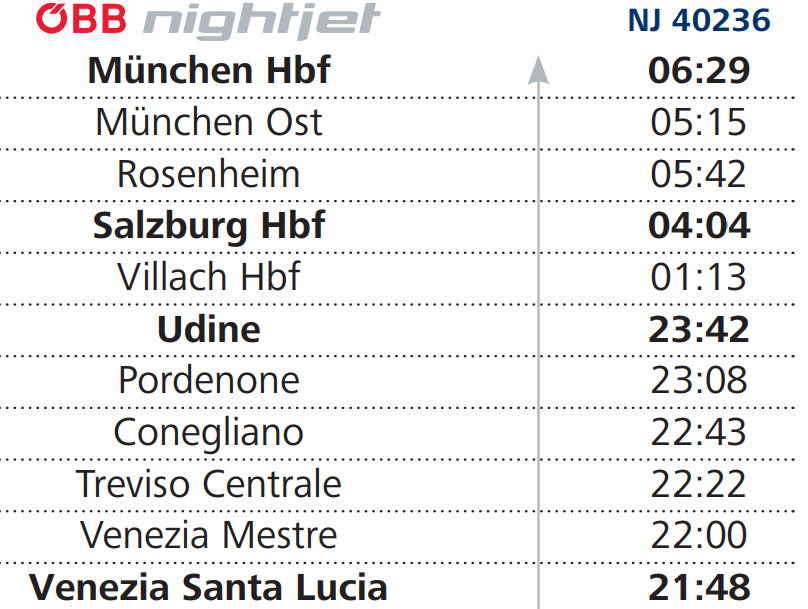 - 베네치아를 출발해 뮌헨 까지 가는 직행열차가 하루에 1~2회 정도 운영된다.