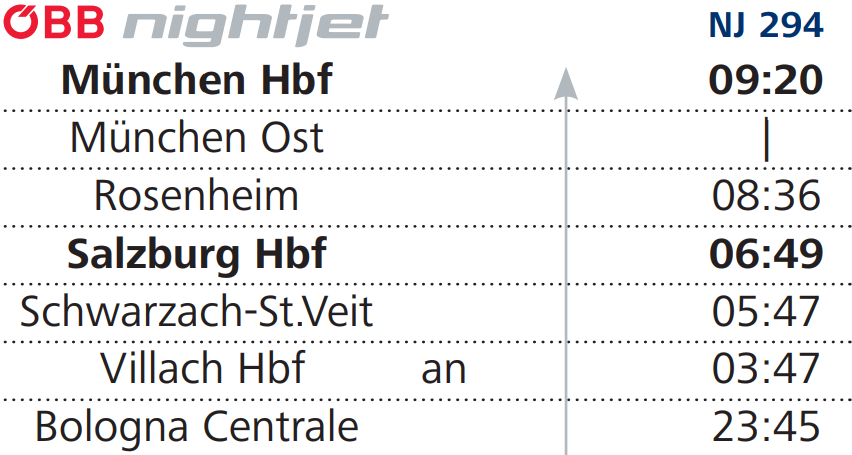 - 주간과 야간에 1~2대씩의 스케줄 편성이 있으며, 베로나, 인스부르크 등을 거쳐 뮌헨으로 간다.