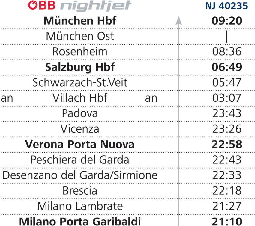 - 밀라노에서 출발하는 야간열차가 중간에 베로나와 잘츠부르크 등을 거쳐 뮌헨까지 간다.