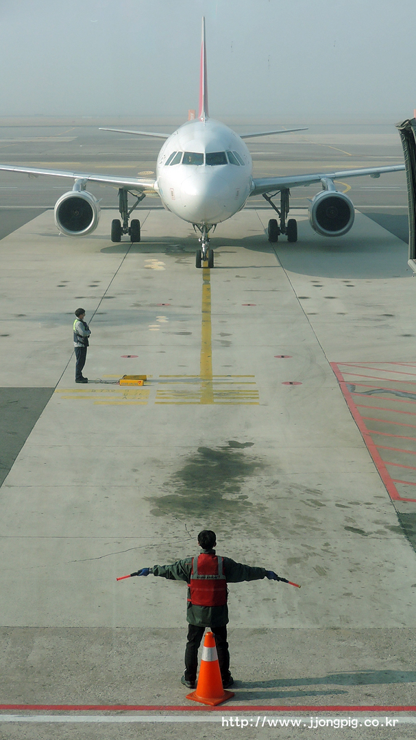 진에어도 보이고, 아시아나항공도 보인다. 김포공항의 14번 게이트 부근을 가면 유도사의 지시에 따라 비행기가 게이트 앞으로 오는 모습을 볼 수 있다.