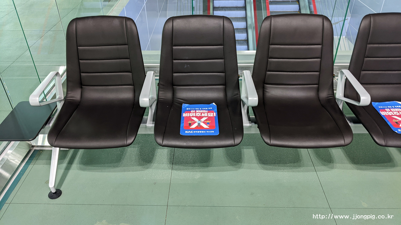 그래도 아직은 사회적 거리두기 스티커가 의자에 붙어있는 편이다.