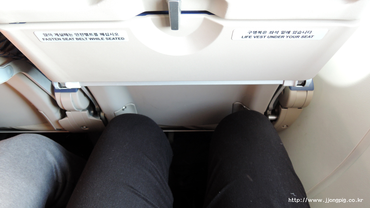 좌석의 앞-뒤 간격은 29인치 정도 될것 같은데, 포켓이 없다보니 무릎쪽에 조금 공간이 생긴다.