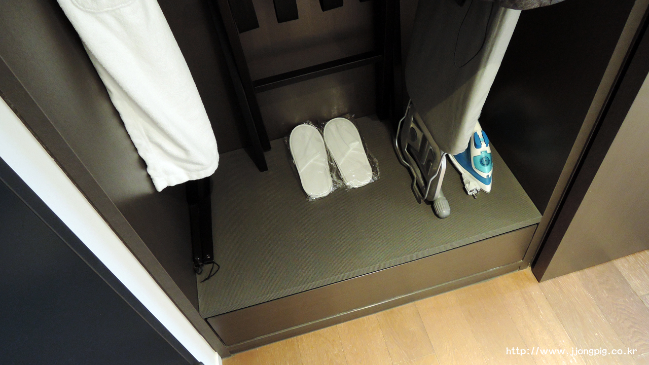 출입문 옆에 옷장이 있는데, 슬리퍼 및 다리미를 포함해서 있을거는 다 있다. 심지어 멀티탭도 준비되어 있고, 장기 투숙이면 세탁물 맡기는 것도 가능하다.