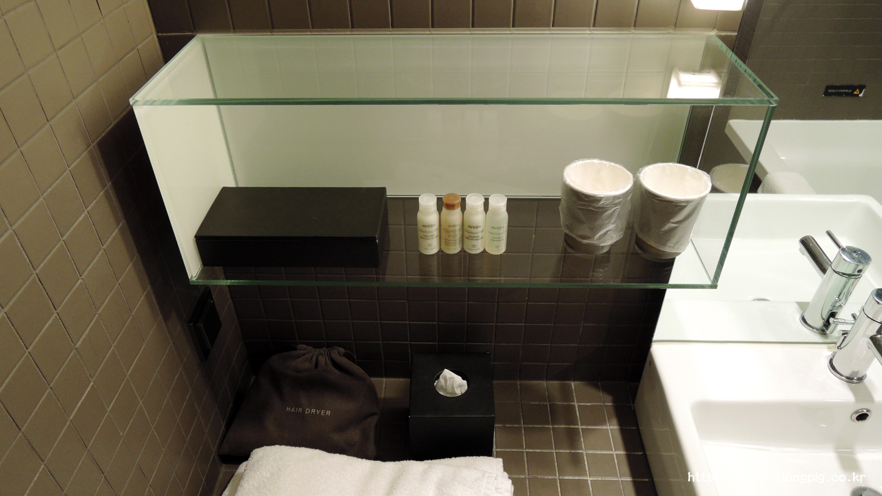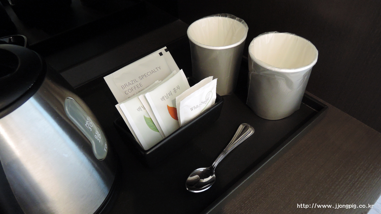 뜨거운물을 끓일때 필요한 전기포트는 기본으로 준비되어 있고, 비닐에 씌여진 일회용 종이컵과 간단한 커피/차 종류 등이 준비되어 있다. 다만 조명등이 별도로 있지는 않아서 초큼 불편할 수 있는 구조다.