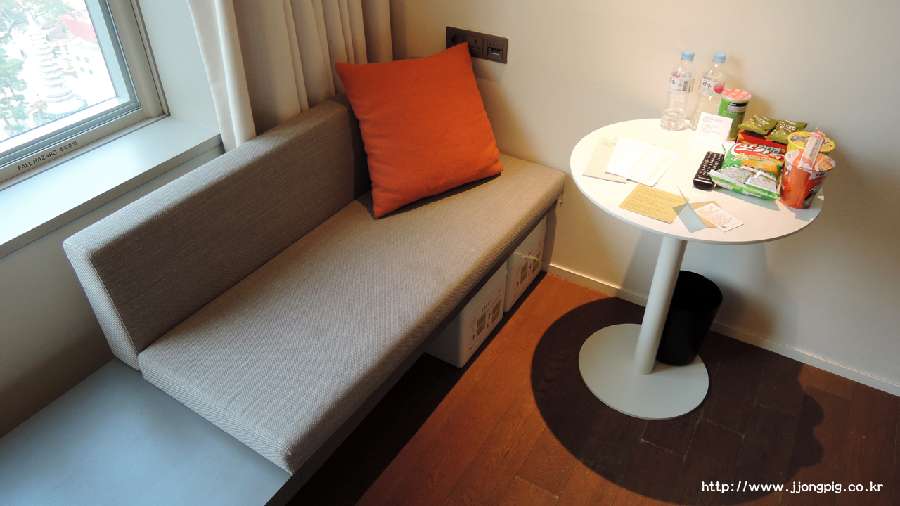 창가쪽으로 소파겸 캐리어 등을 펼칠 공간이 구성되어 있다. 그 옆에는 플러그가 있는데, 멀티어댑터 없이 자유롭게 사용할 수 있는 형태다.