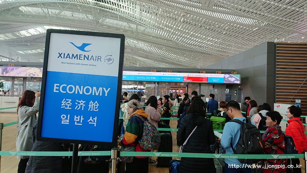 인천공항 제2터미널에 도착해서 C영역의 35~39번 카운터를 찾아가면 된다. 샤먼항공 오픈 전에 인도네시아의 가루다 항공이 사용을 하고 있었는데, 너무 빨리 도착한 손님들은 가루다 항공사 카운터에 샤먼항공 수속을 하는 경우도 종종 보인다.