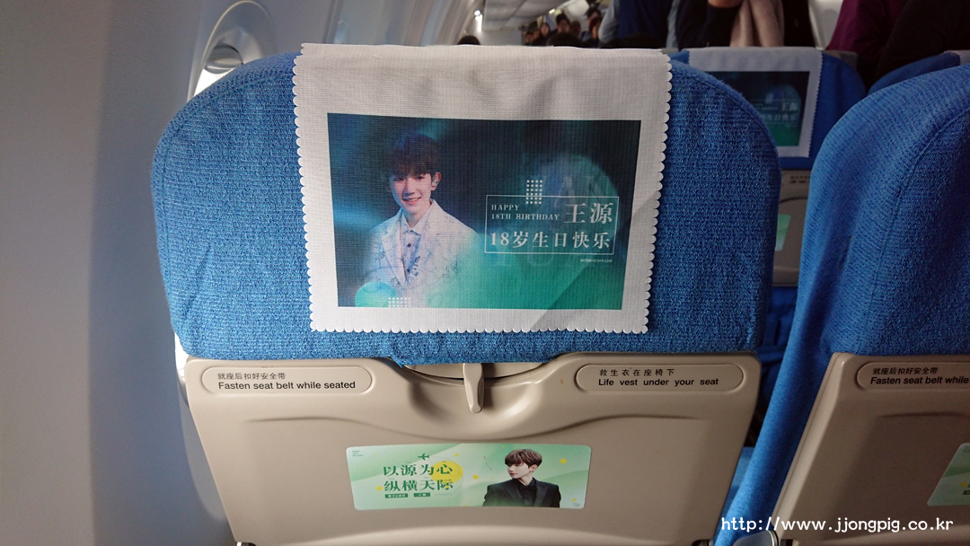 승무원 분들은 약간 치파오 스타일의 유니폼 같았다. 단거리 구간이 거의 그렇듯 3-3 배열로 구성되어 있는데, 자리에 앉으니 어떤 연예인 홍보로 도배가 되어있었다. 잘은 모르겠지만…. 연예인 같다.