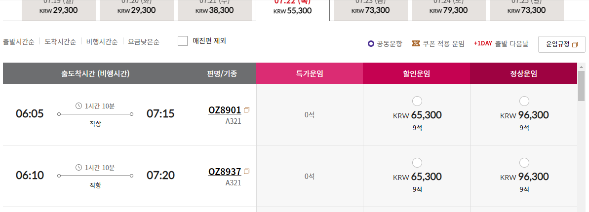 2) 예약 -> 항공권 예약 -> 출발지, 도착지, 탑승일 입력 -> 조회 클릭