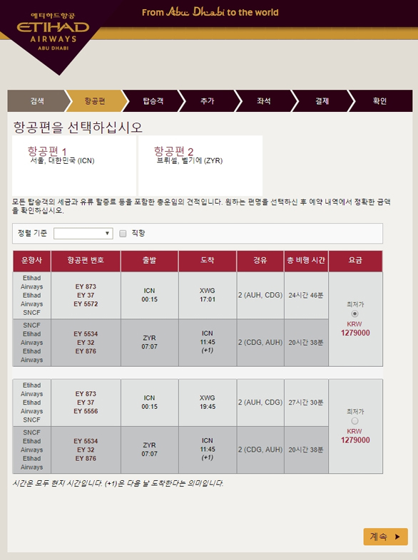 에티하드 항공으로 스트라스부르그(XWG)와 브뤼셀(ZYR)의 연결 예시를 볼 수 있다. 에티하드 항공은 브뤼셀에 취항하고 있음에도 불구하고 파리에서의 열차 연결 여정도 같이 판매하고 있음을 알 수 있다.