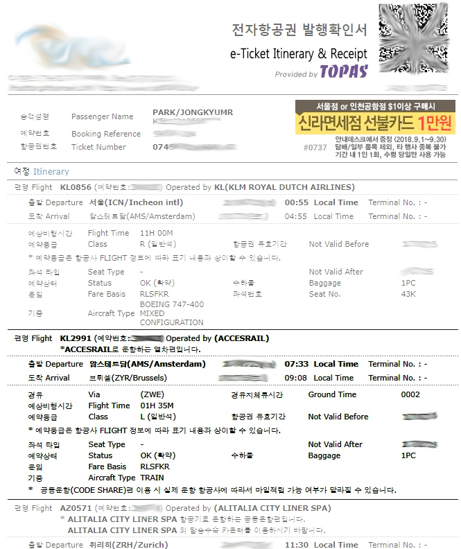 브뤼셀까지 기차이용을 안하면 노쇼(No-Show)처리가 되기 때문에 항공편의 다음여정을 이용할 수 없다. 반대방향도 동일하다. 분명히 기억해야 할것은 항공편명으로 구매를 한것이다.