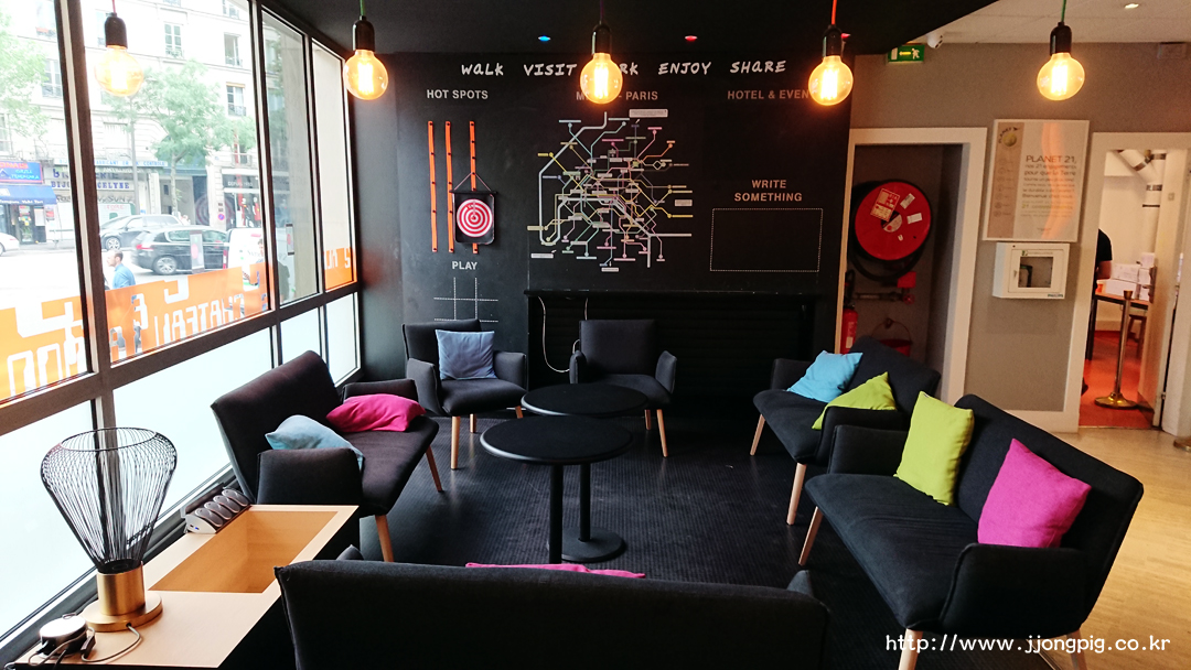 호텔에 들어가면 바로 리셉션을 마주하게 되는데, 파리에 있는 호텔 치고는 그렇게 작지는 않은편이다. 더불어 ibis styles 컨셉에 맞게 알록달록한 이미지로 경쾌한 느낌이 좋다.