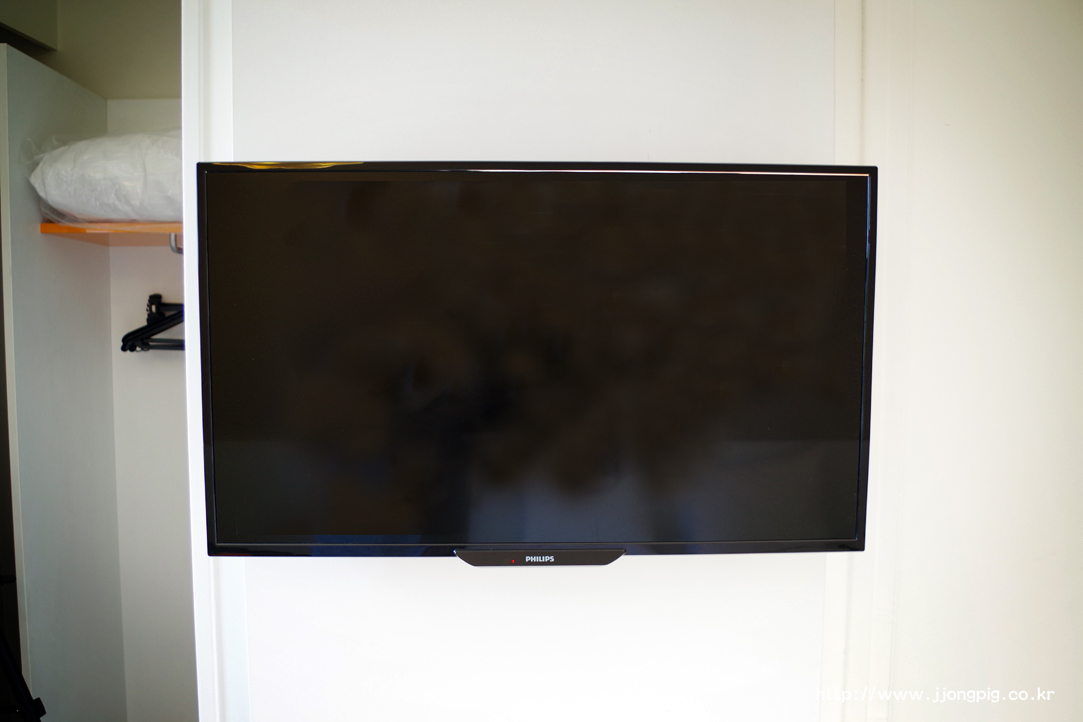 옷걸이 등도 있고 TV도 평면TV이며, 케이블까지 별도로 준비하면 노트북 등에서 TV로 연결도 가능한 콘센트도 갖추고 있다.