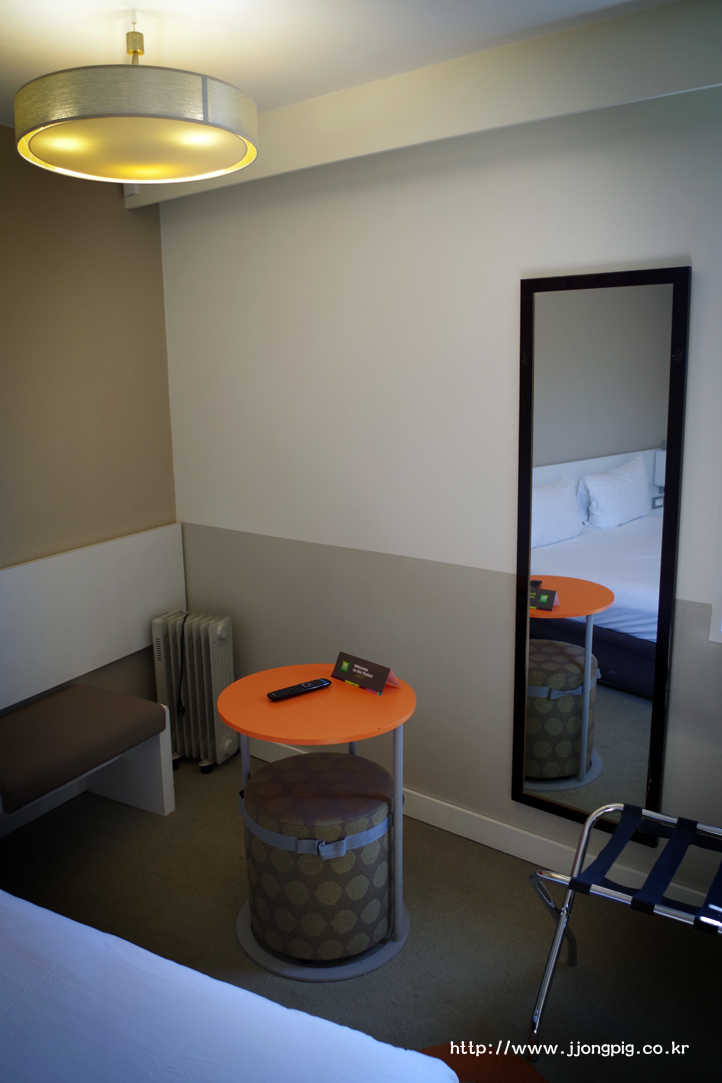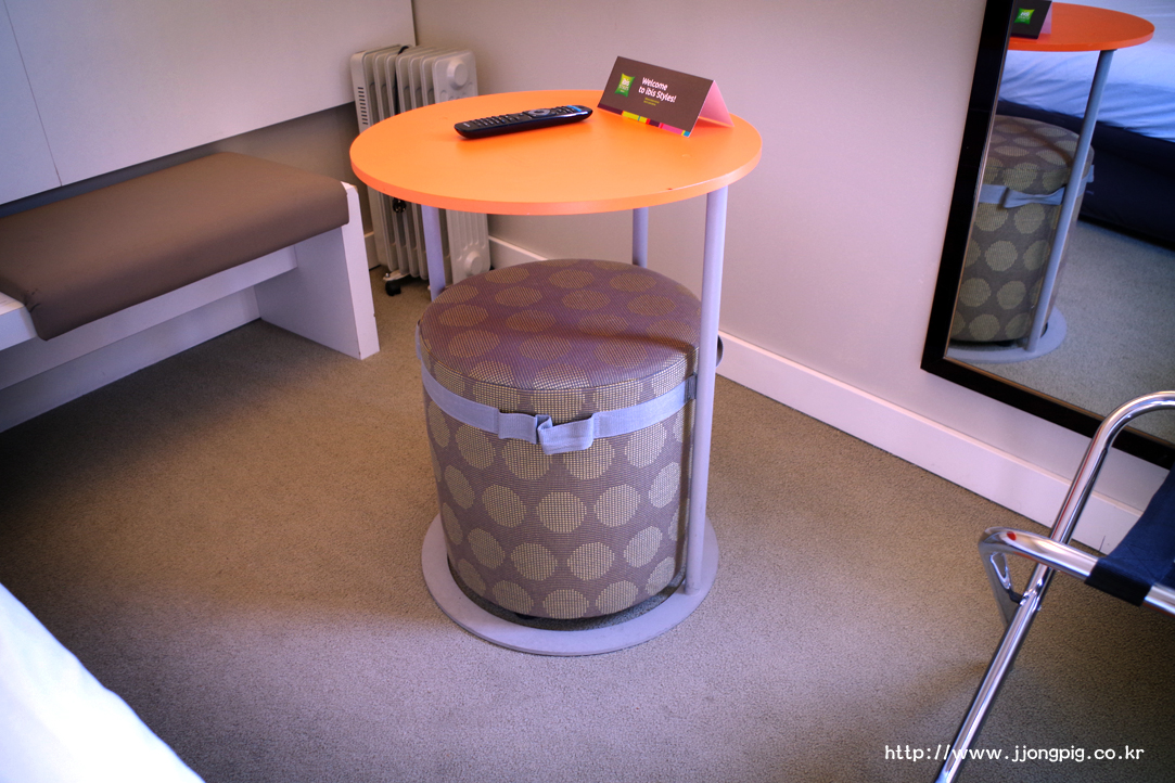객실에 책상이 있는것은 아니고 원형의 테이블과 의자가 있는데, 늦은 밤에 마트에서 구입한 먹을거리들 올려놓기에는 오히려 실용적인것 같다.