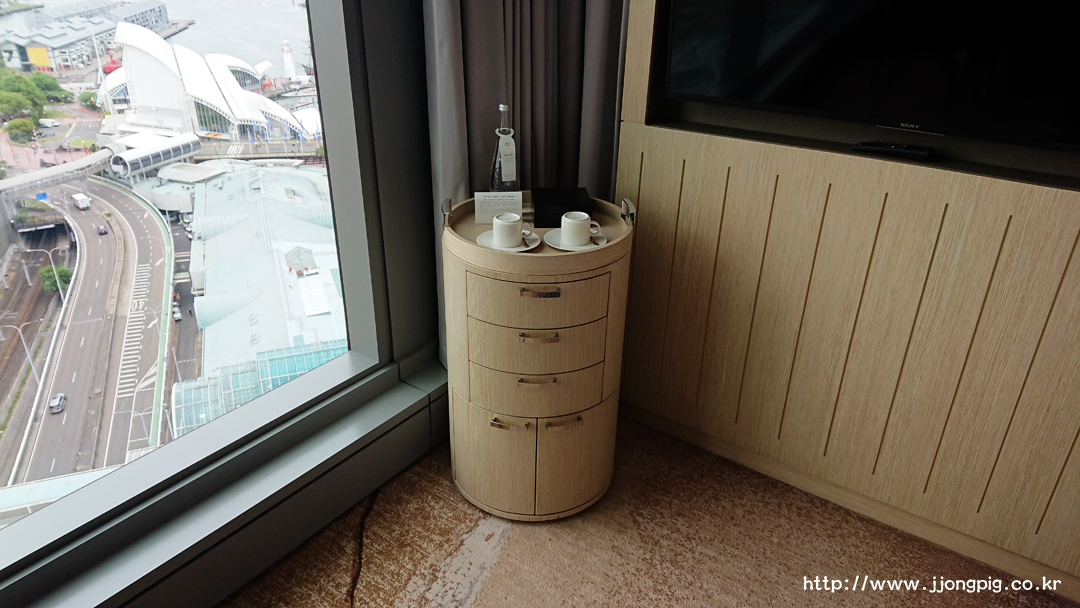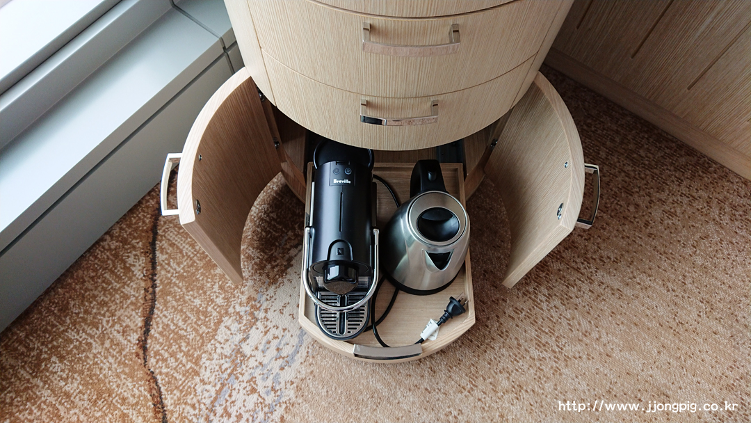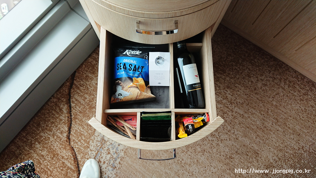 미니바가 TV 옆에 있는데 구성이 다양하다. 커피와 유리잔이 있고, 오프너도 구비되어 있다. 스넥 종류는 간단히 구성되어 있는데, 그 안에 멀티어댑터가 있다. 가져가면 과금되지만 투숙기간 동안 사용하는 것은 문제 없다. 캡슐커피와 커피머신 및 전기포트가 있었는데 문제는 플러그가 근처에는 없는 것 같았다. 그래서 사용하려면 기계를 옮겨야 한다. 미니바에 있는 물은 유료다.