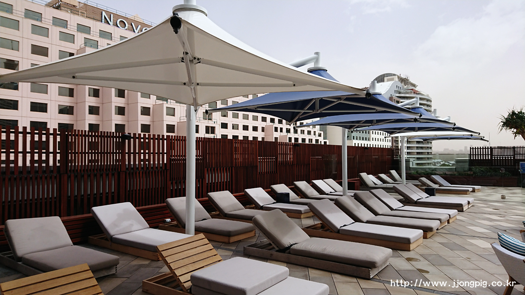 여기 소피텔 호텔에서 유명한 것 중 하나는 수영장이었다. 4층으로 가면 두 시설이 모두 붙어있다. 이용할 때는 키카드를 터치해야 문이 열린다.