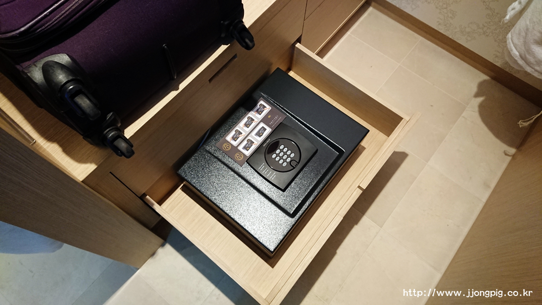 캐리어를 두는 곳 밑에 서랍이 있는데, 금고부터 시작해서 세탁 서비스를 맡기기 위한 비품들이 셋팅되어 있다.