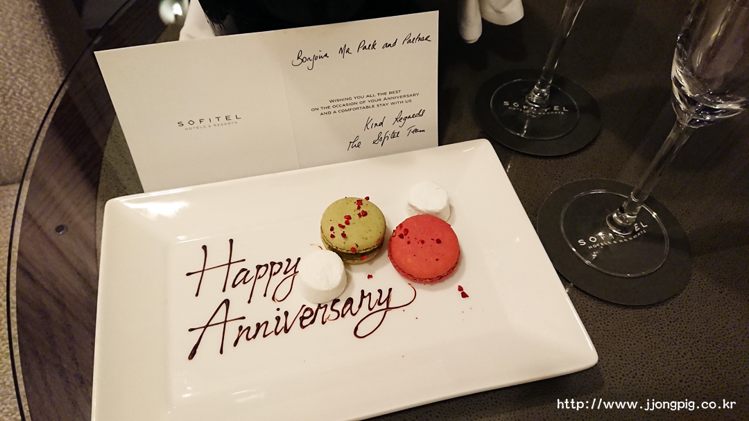 말 그대로 결혼기념일이어서 이 호텔을 이용한 것인데, 호텔측에 요청을 하면 위와 같이 디저트와 샴페인을 무료로 제공해준다. 이런거는 뭐랄까. 개런티는 안되지만 대부분의 고급 호텔이라면 거의 해주는 서비스라서 활용해볼만 하다. 호텔예약이 되었으면 호텔 측에 전화나 메일로 요청할 수 있다. 다만 최소 하루전에라도 요청해야 호텔도 준비할 수 있다.