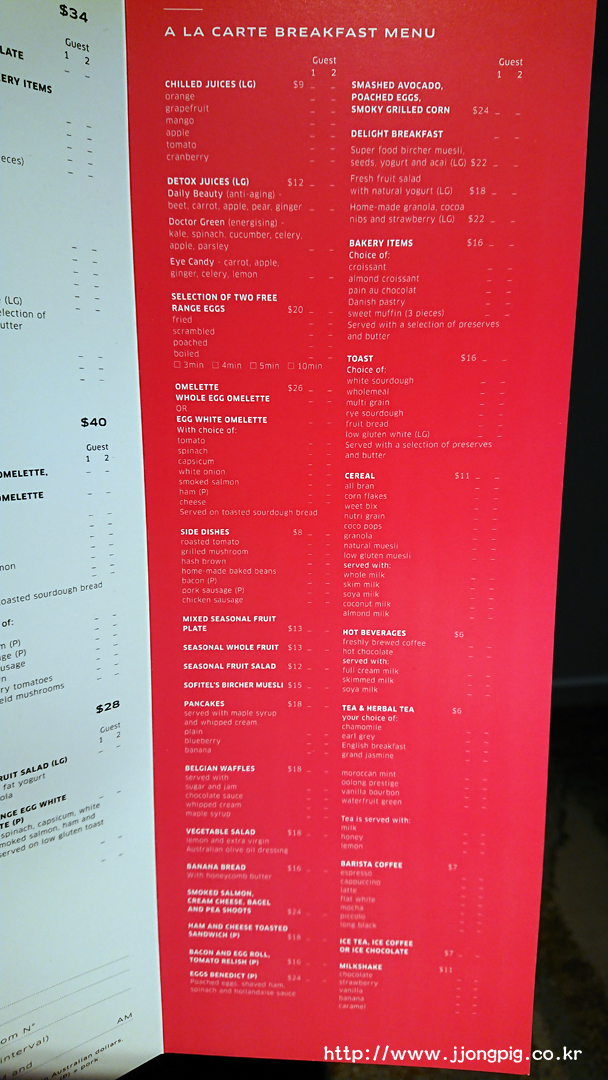 좋은 호텔… 특히 뷔페 스타일 식사를 하게 되면 메뉴를 볼 때 점점 어떤 종류가 있는지 보게된다. 예를 들어 베이컨, 빵 등 큰? 종류가 아니라 빵을 내놓더라도 어떤 빵 종류가 있는지 본다는 뜻이다. 그런데 이 곳 Sofitel 에서는 그 점이 아쉬웠다. 조금 좋은 4성급 호텔에서도 맛볼 수 있는 메뉴들일뿐 뭔가 색다른? 메뉴가 있다고 하기에는 부족했다.