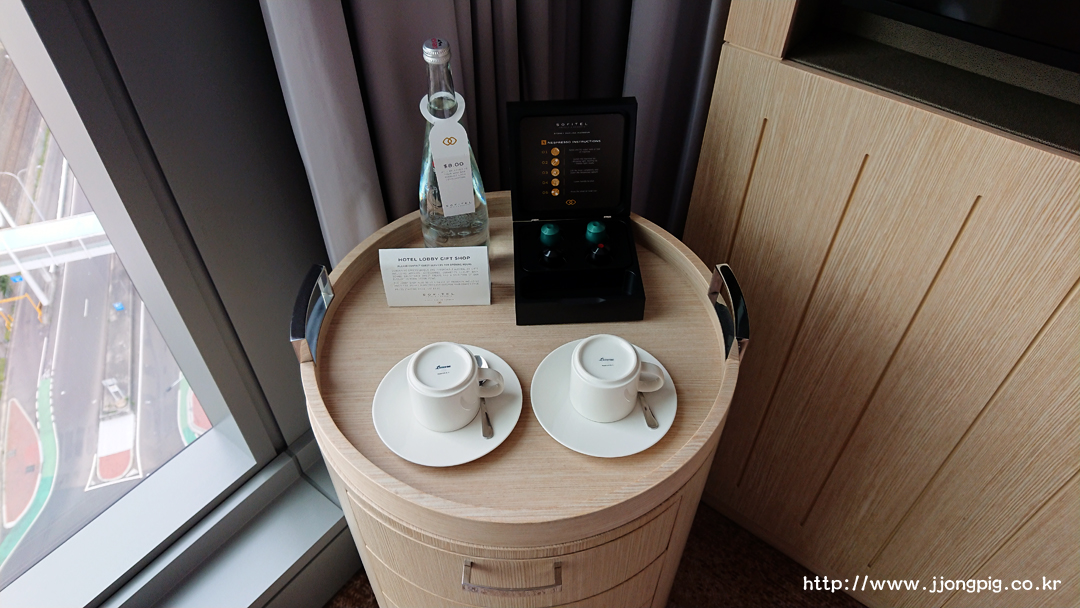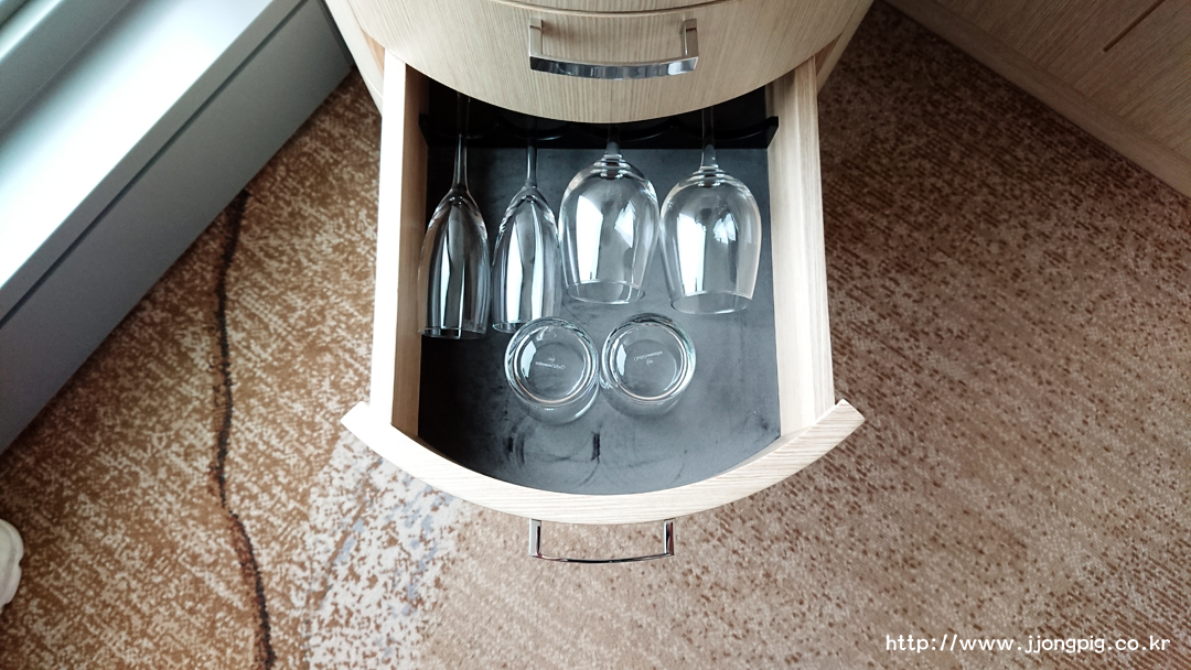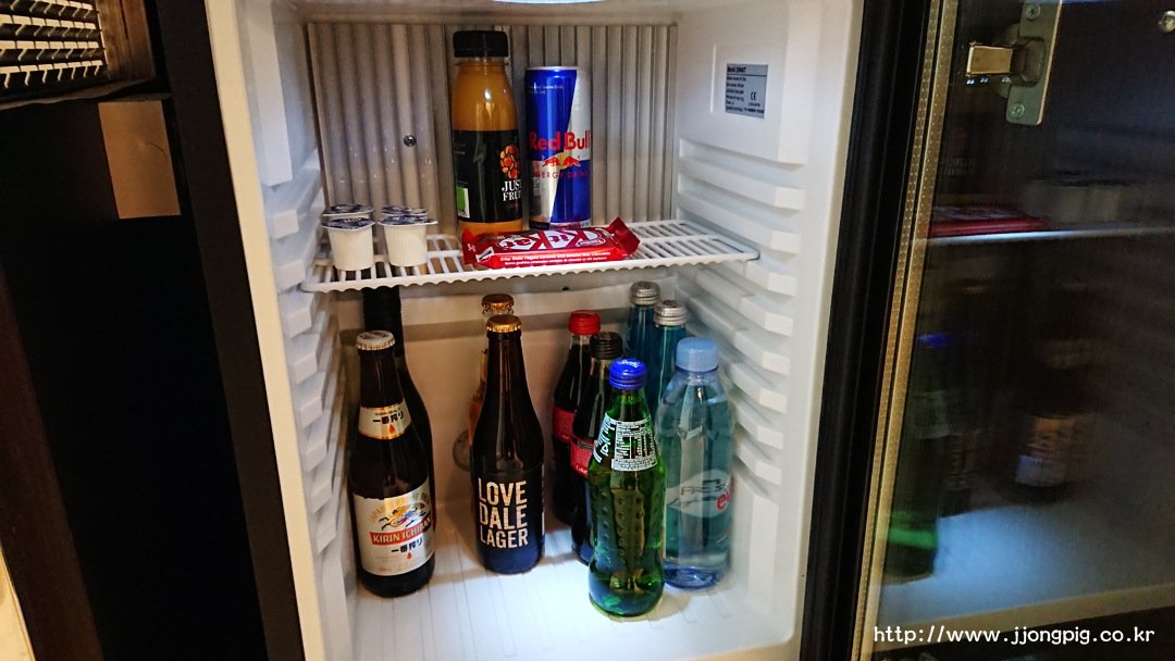 미니바가 TV 옆에 있는데 구성이 다양하다. 커피와 유리잔이 있고, 오프너도 구비되어 있다. 스넥 종류는 간단히 구성되어 있는데, 그 안에 멀티어댑터가 있다. 가져가면 과금되지만 투숙기간 동안 사용하는 것은 문제 없다. 캡슐커피와 커피머신 및 전기포트가 있었는데 문제는 플러그가 근처에는 없는 것 같았다. 그래서 사용하려면 기계를 옮겨야 한다. 미니바에 있는 물은 유료다.