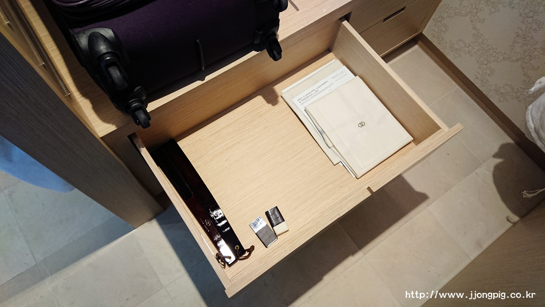 캐리어를 두는 곳 밑에 서랍이 있는데, 금고부터 시작해서 세탁 서비스를 맡기기 위한 비품들이 셋팅되어 있다.