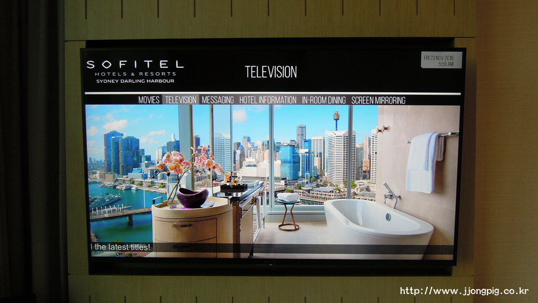 큰 사이즈의 평면 TV가 있는데 침대에서 볼 수 있게 따로 뺄 수 있다. 그런데 우리나라의 아리랑 TV는 물론 YTN까지 나오지만, 그 흔한 BBC나 CNN 채널은 찾아볼 수 없었다. 이 호텔의 특징이라기 보다는 호주에 있는 호텔들의 전반적인 특징같다.