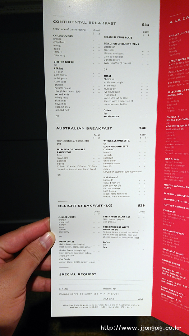 좋은 호텔… 특히 뷔페 스타일 식사를 하게 되면 메뉴를 볼 때 점점 어떤 종류가 있는지 보게된다. 예를 들어 베이컨, 빵 등 큰? 종류가 아니라 빵을 내놓더라도 어떤 빵 종류가 있는지 본다는 뜻이다. 그런데 이 곳 Sofitel 에서는 그 점이 아쉬웠다. 조금 좋은 4성급 호텔에서도 맛볼 수 있는 메뉴들일뿐 뭔가 색다른? 메뉴가 있다고 하기에는 부족했다.