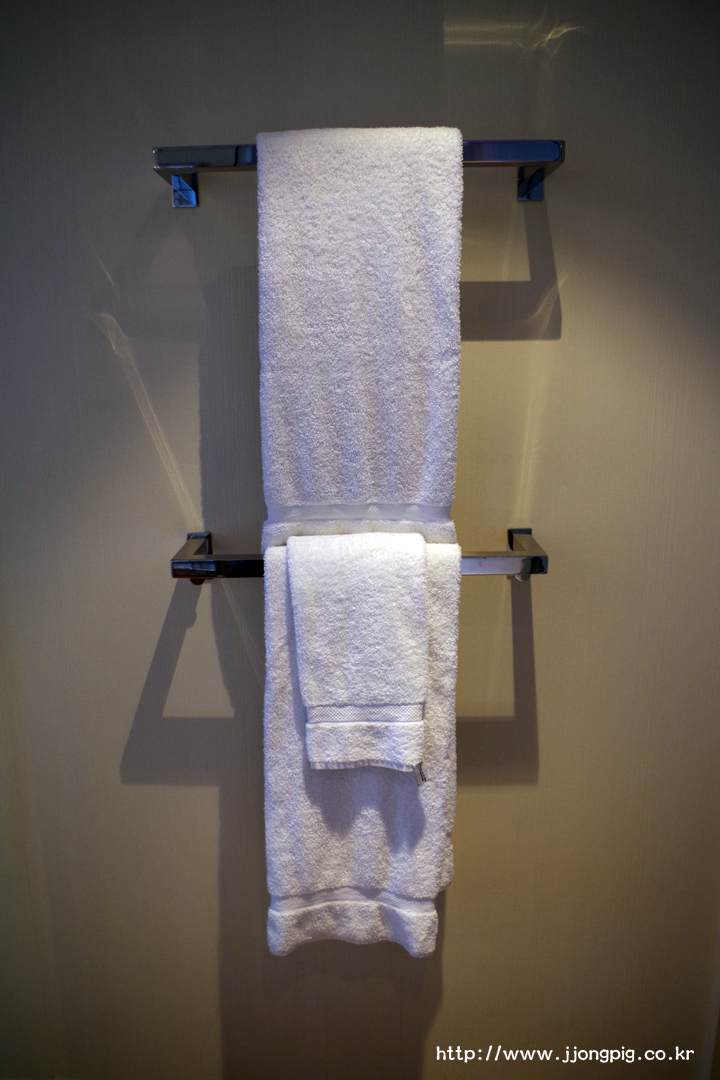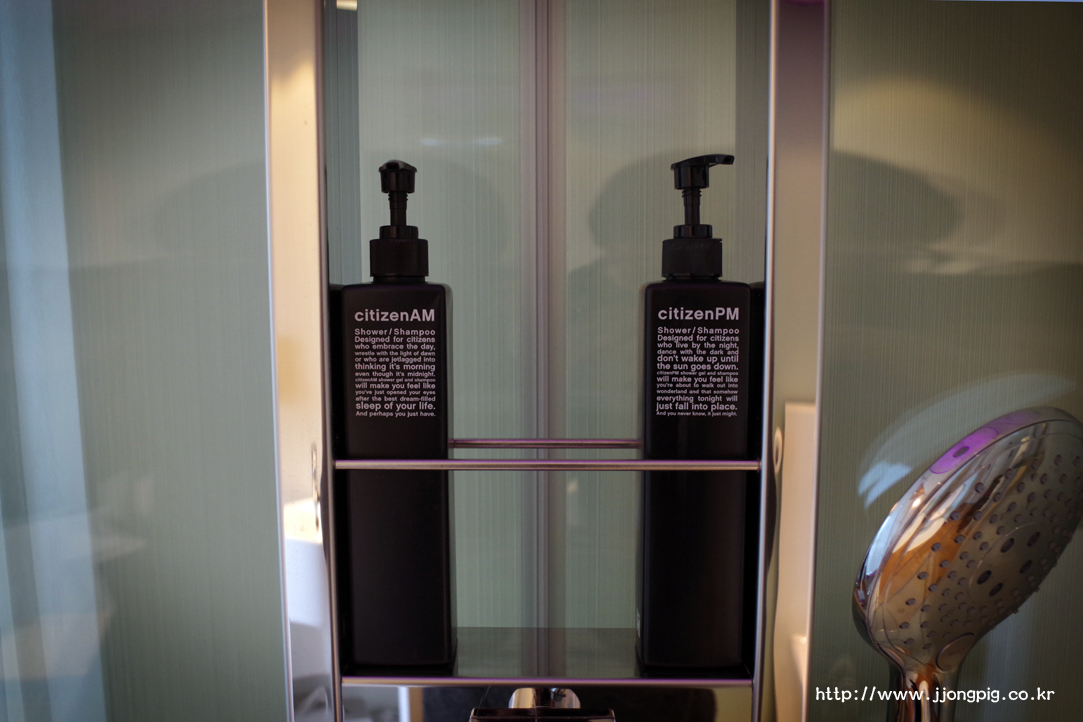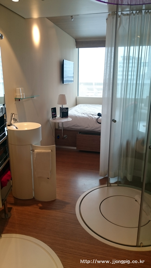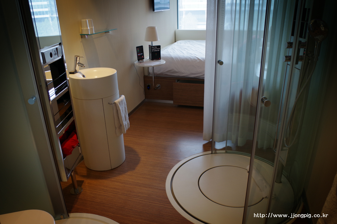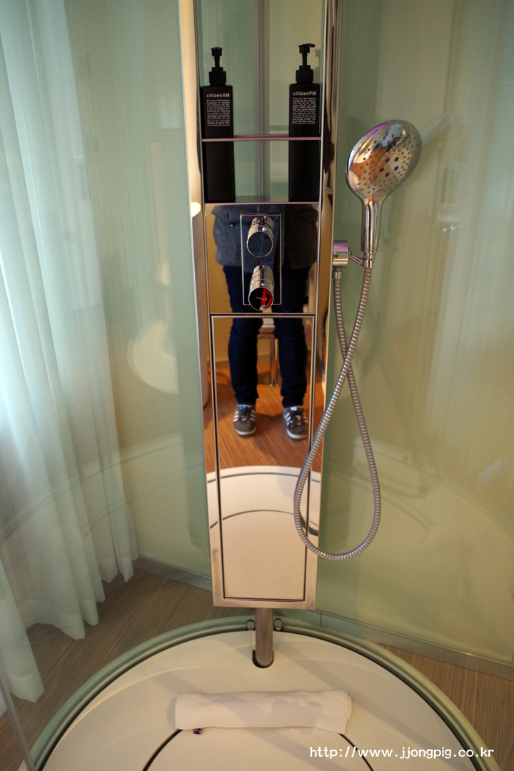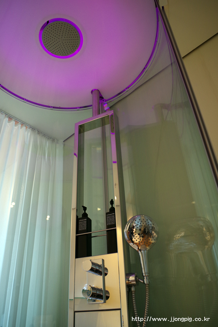 이 호텔이 왜 더블과 싱글룸만 있는지 알게 해주는 욕실인데, 동그란 샤워문이 유리로 되어 있어서 동성끼리 숙박하기는 좀 그럴 수 있을 것 같다. 씻을 때 샤워기로 부족하면 위쪽 천정에서 물이 나오도록 설정할 수 있다.