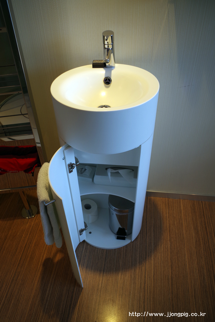 세면대는 욕실 바깥에 별도로 있으며 그 안에 다양한 비품들이 셋팅되어 있다.