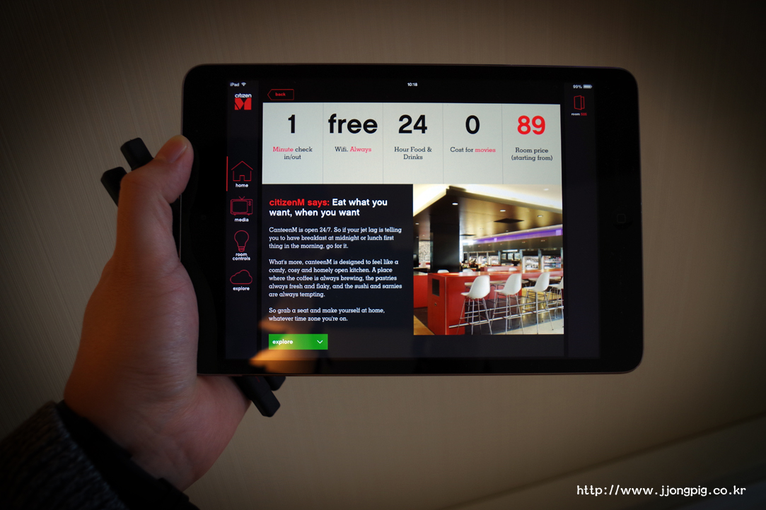 이 호텔의 가장 큰 특징은 아이패드 같은 태블릿을 활용한 객실 컨트롤 기능이다. 객실내 조명부터 여러가지를 아이패드 하나로 조절할 수 있는데, 확실히 젊은 사람들을 위한 매력 포인트를 갖추고 있다.