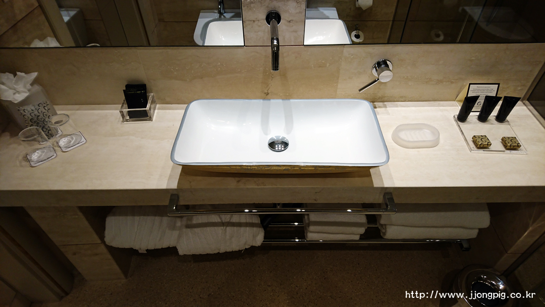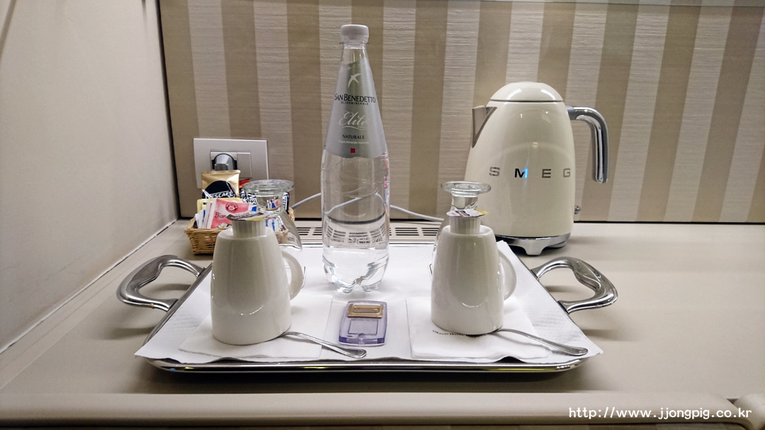 옷장이 있는 공간에는 저렇게 미니바와 차, 커피를 마실 수 있는 것들이 준비되어 있다. 전기 포트 제품이 SMEG 인데 호텔에 있는 전기포트들 중에서는 매우 유니크한? 제품을 썼던것 같다. 생수는 무료인데 매일 한 병씩 제공해준다.