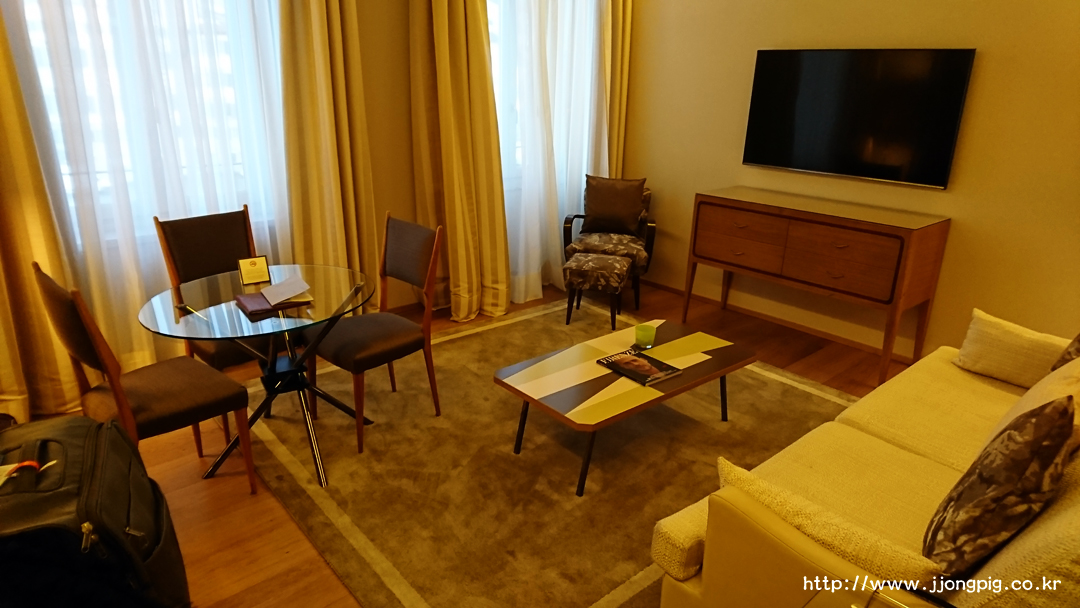 소파와 테이블 등이 있는 living 룸이 별도로 있다. 옷장도 별도 공간에 구분되어 있는데 방 크기가 넓은 편이었다. 객실내 온도 조절도 룸 별로 가능하다. (개인적으로 침대도 꽤 좋았던것 같다.)