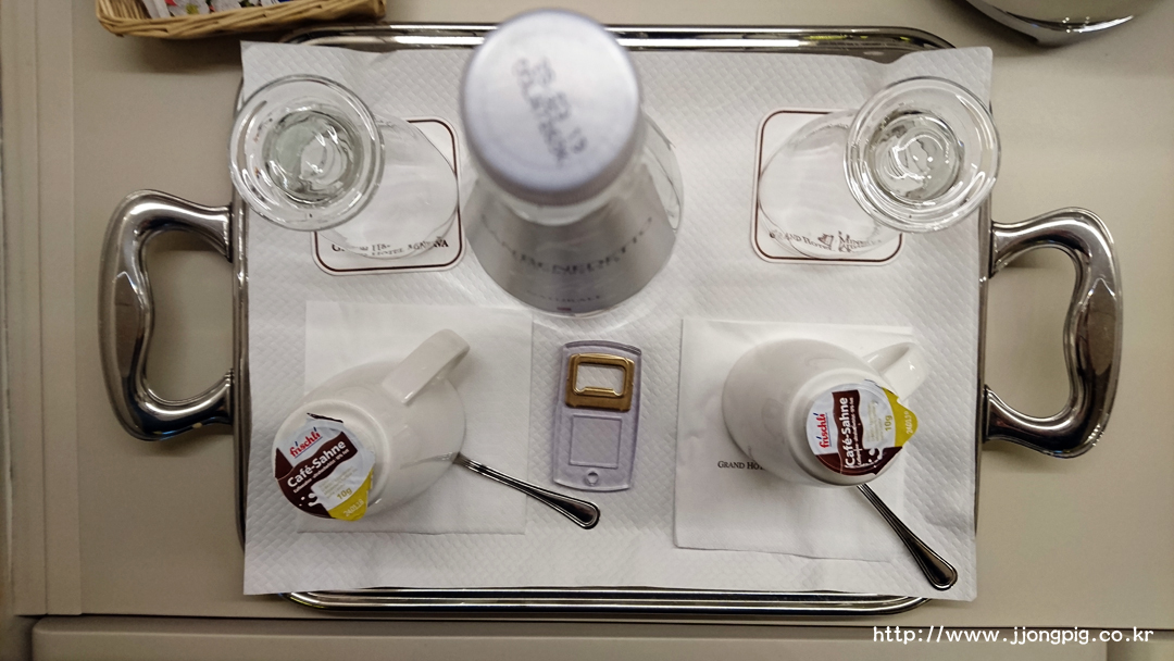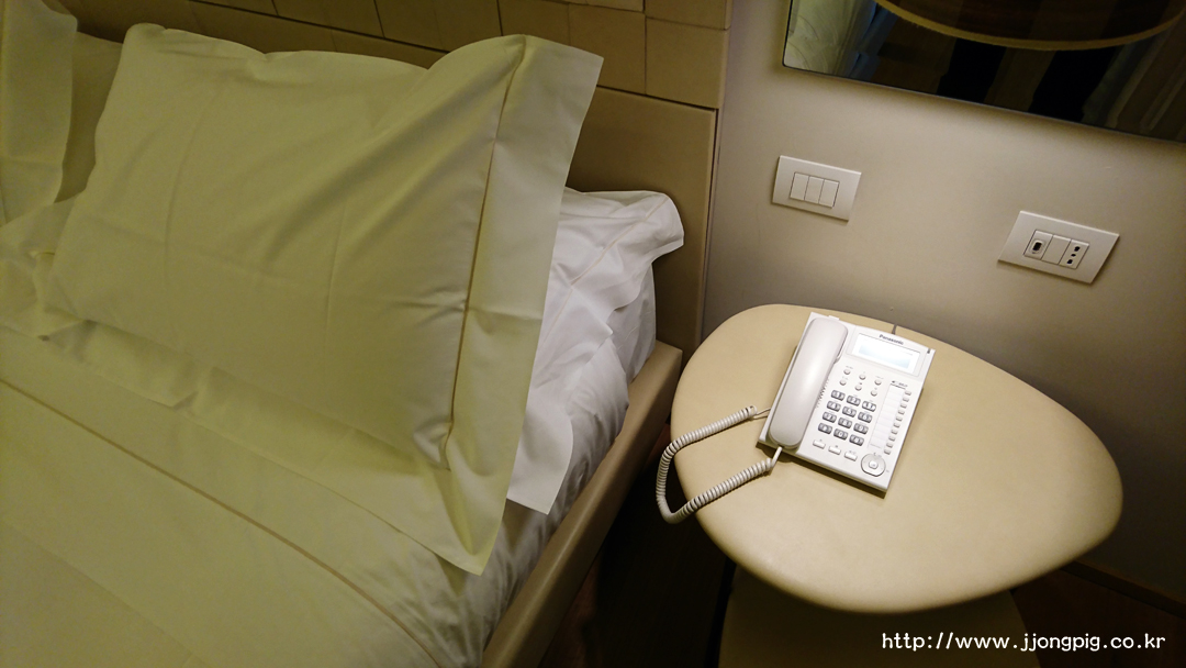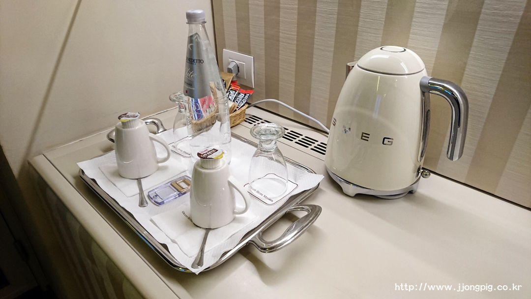 옷장이 있는 공간에는 저렇게 미니바와 차, 커피를 마실 수 있는 것들이 준비되어 있다. 전기 포트 제품이 SMEG 인데 호텔에 있는 전기포트들 중에서는 매우 유니크한? 제품을 썼던것 같다. 생수는 무료인데 매일 한 병씩 제공해준다.