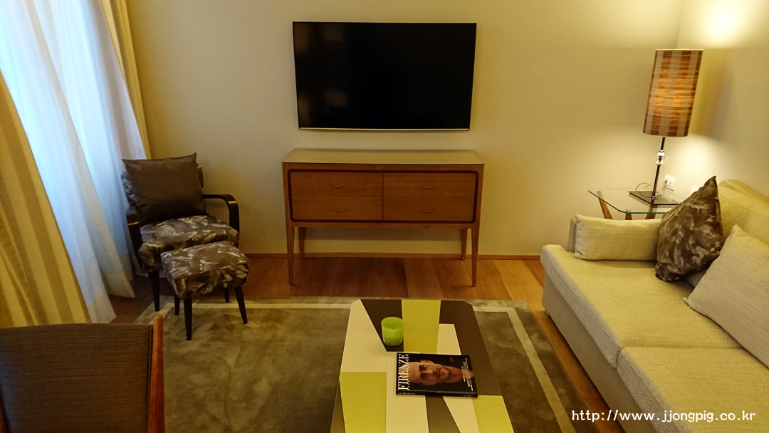 소파와 테이블 등이 있는 living 룸이 별도로 있다. 옷장도 별도 공간에 구분되어 있는데 방 크기가 넓은 편이었다. 객실내 온도 조절도 룸 별로 가능하다. (개인적으로 침대도 꽤 좋았던것 같다.)