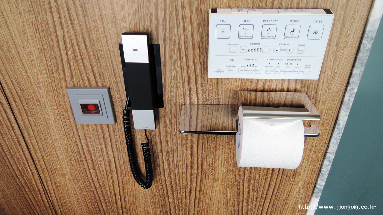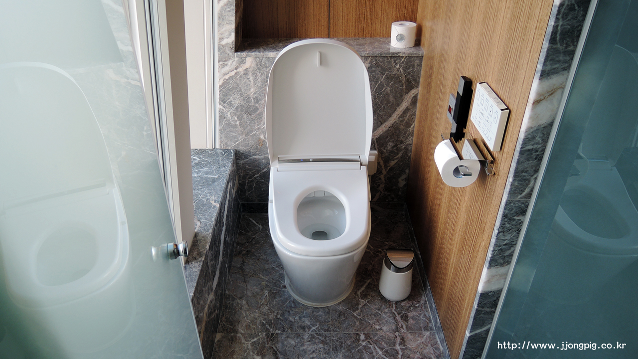 비데가 일본 TOTO 제품인데, 분사방식이 한국 제품과는 많이 다른것같다. 센서가 있어서 앞에 뭔가가 움직였다 하면 자꾸 변기 뚜껑이 열릴 정도로 아주 예민하다. 그래서 유리문을 잘 닫아두는것이 좋을 것 같다.