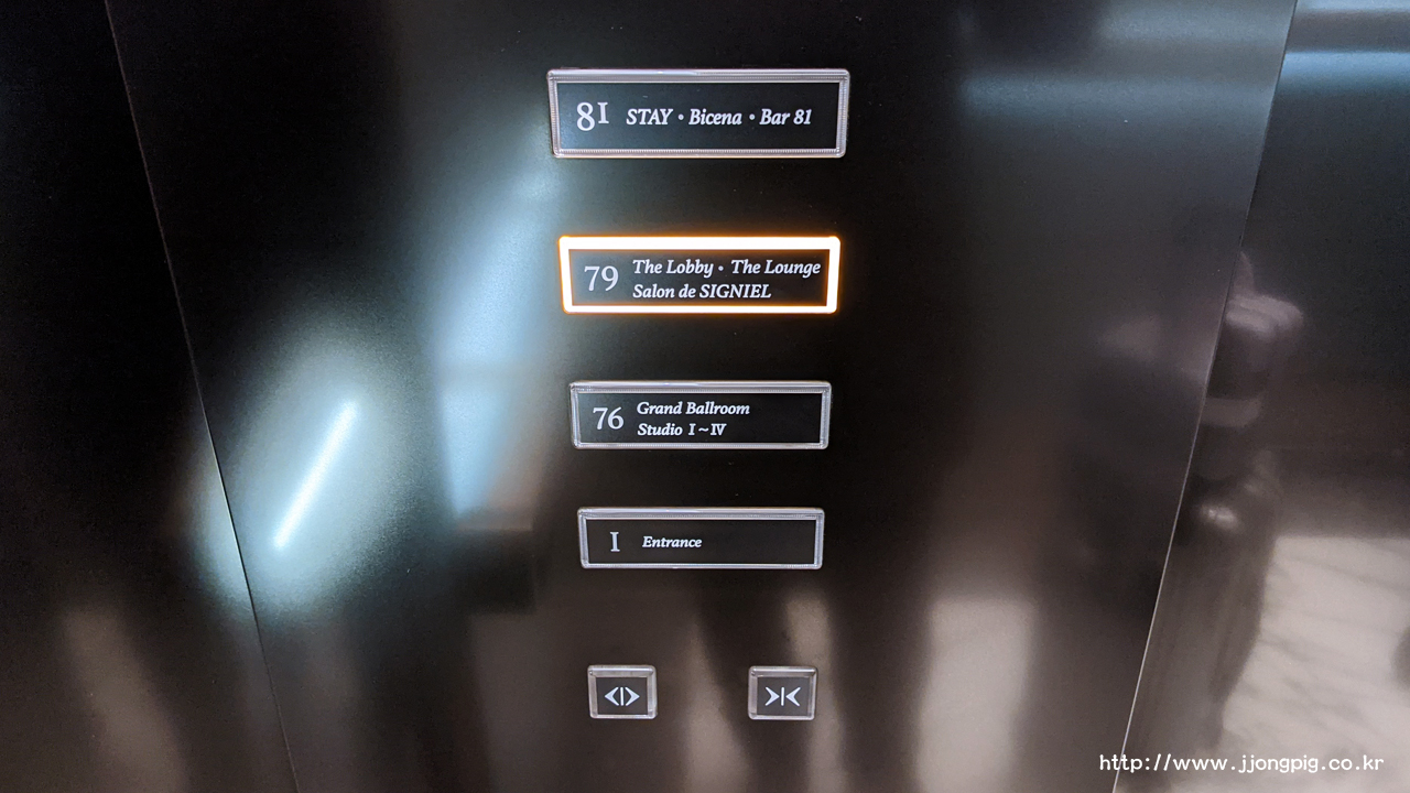 호텔 리셉션이 있는 로비는 79층이다. 1층에서 로비까지 연결되는 엘레베이터는 총 4대였고, 버튼을 누르면 대기 시간이 길지 않았는데, 1층에서 79층까지 1분도 안걸리는 초고속 엘리베이터였다.